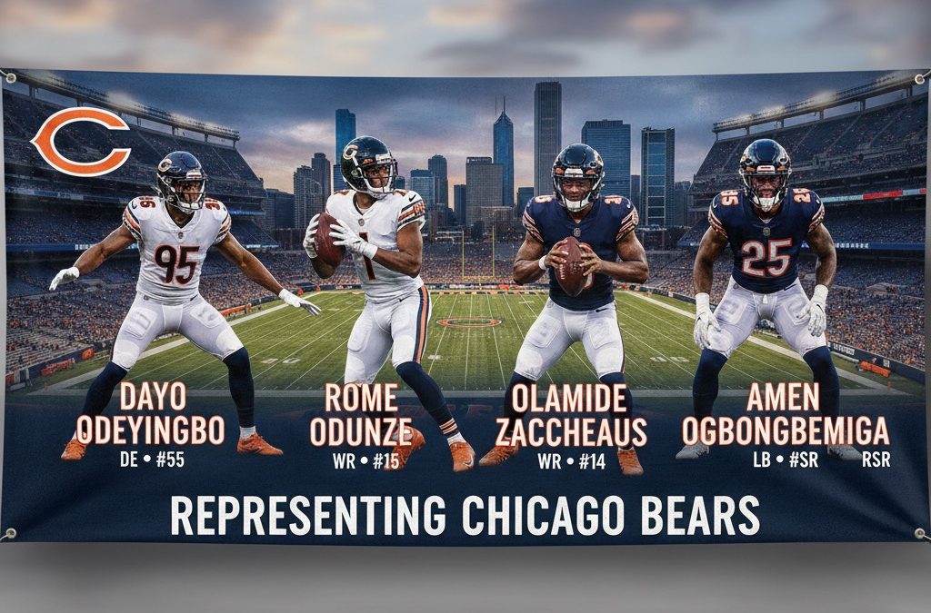 **Dayo Odeyingbo (#55)**, the powerful defensive end who made Chicago home in March 2025, signed a three-year, $48 million contract that reflected the Bears’ belief in his potential. Born in Brooklyn, New York to Nigerian immigrant parents Gary and Betty who journeyed from Nigeria to England to the United States, Dayo’s passion for the game runs deeper than statistics. “I’m playing for legacy,” he has said. “It’s bigger than just me. I’m playing for family.” His parents’ courageous journey fuels his fire every Sunday, and he chose Chicago specifically because of its rich history and tradition. Though his 2025 season was cut short by an Achilles injury in Week 9, we know this warrior will return stronger, carrying the resilience that flows through Nigerian blood.